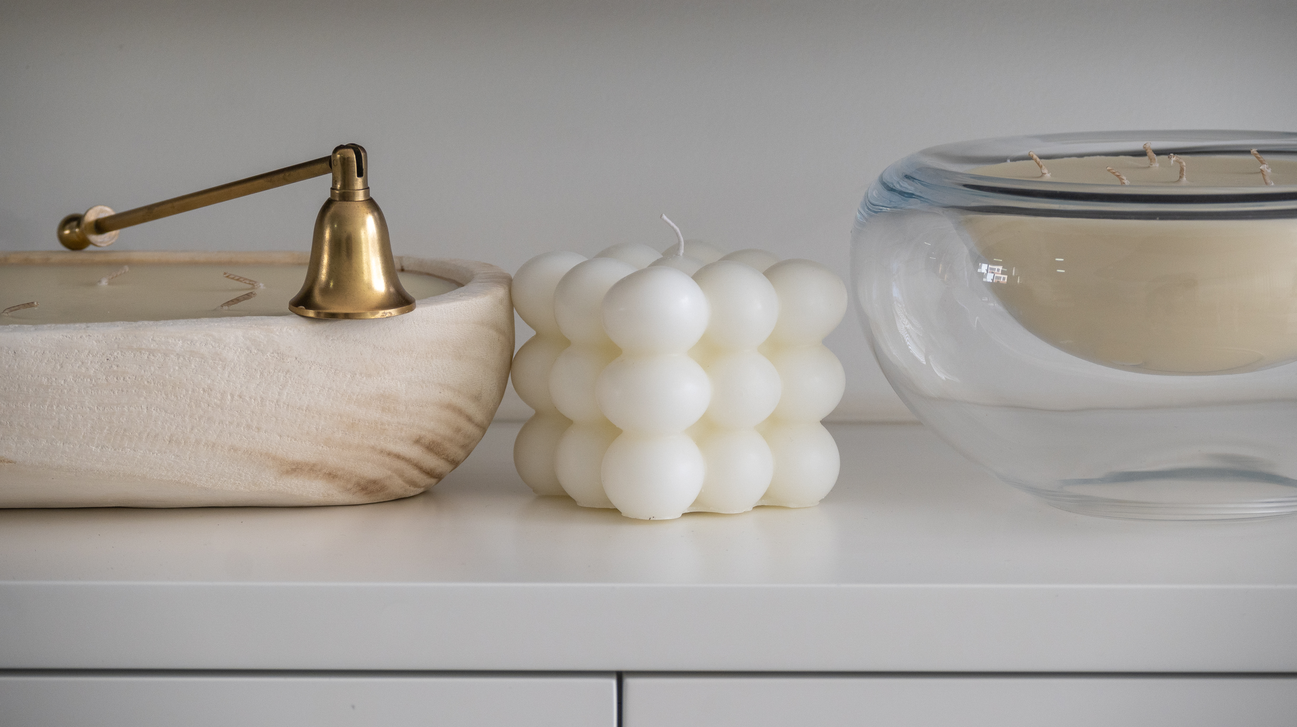 נר ריחני דקורטיבי בכלי מגש עץ מולבן